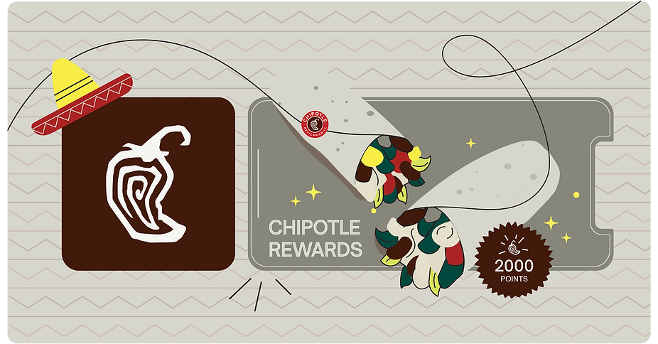 - Each dollar spent at the restaurant, online, or through the app earns Chipotle Rewards members 10 points. 1,250 points will get you a free meal.